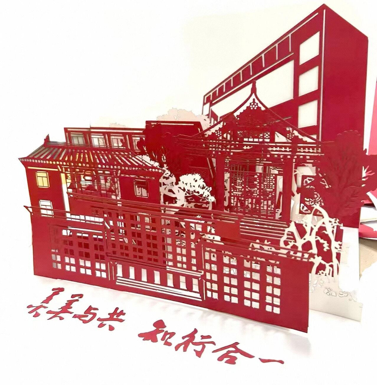 剪纸的镂空透叠、时空写意,借力现代激光雕刻,既能极致复刻纹样精魂,又能凝练勾画学校三校区建筑的独特剪影。