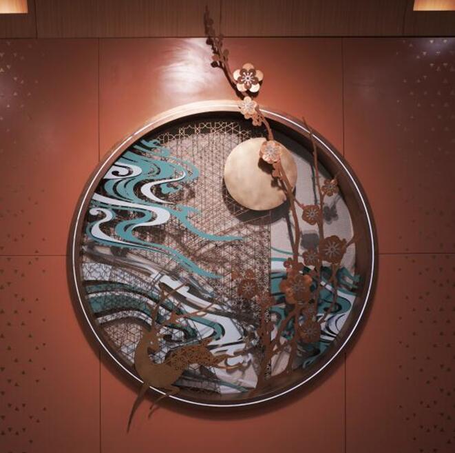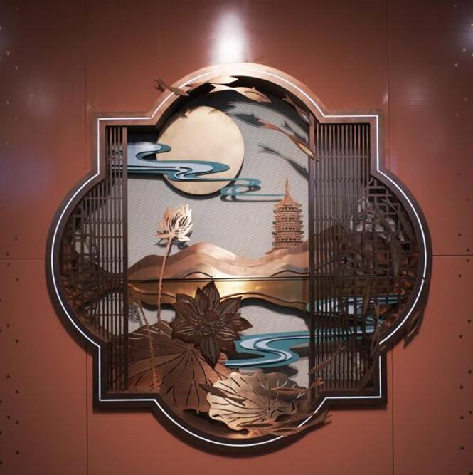 高楼金站的核心主题是“德韵清风”,作品以“梅兰竹菊松荷 ”六君子为主题进行独立创作,设计风格与线路整体装修概念“窗韵”契合,也与该站厅六处艺术品墙体相匹配。作品于窗中以小见大,借用六种自古以来富于文人精神的风雅植物,象征“清廉洁白”的高尚节操,以此寓意中华君子风骨在当代的传承与延续。